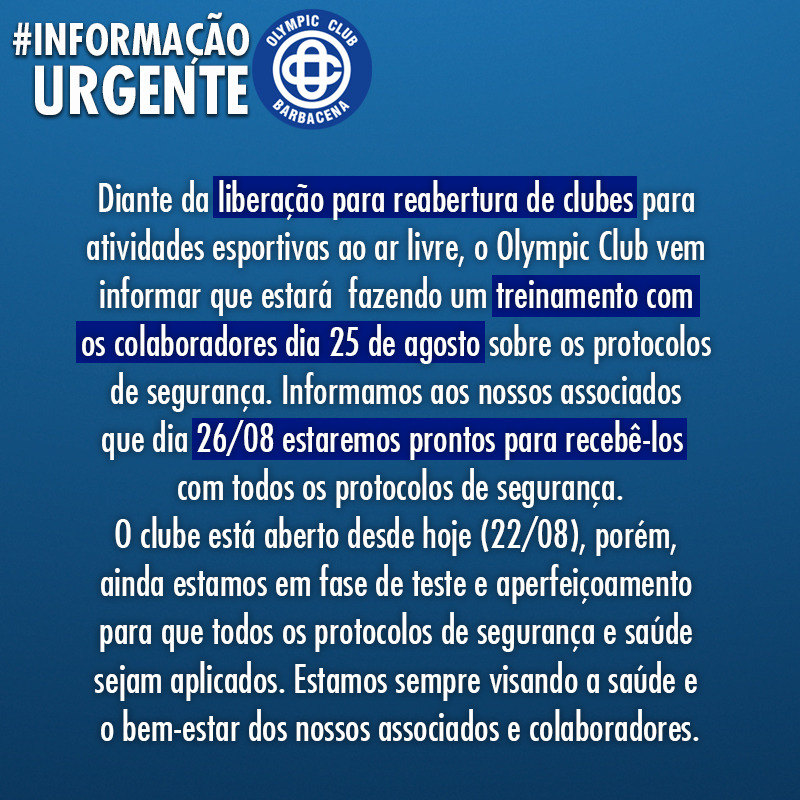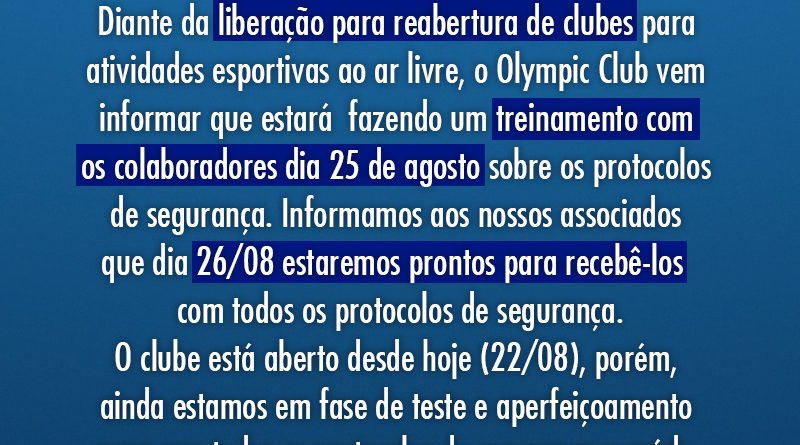 O Olympic Club já está liberado para a reabertura desde hoje (22/08). Dia 25/08 faremos um treinamento com os colaboradores sobre os protocolos de segurança impostos no decreto e, a partir do dia 26/08, já estaremos totalmente prontos para recebê-los da forma mais segura possível. 😷