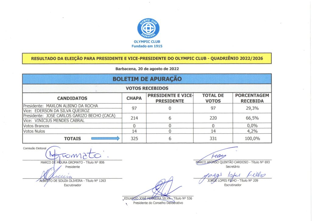 RESULTADO ELEIÇÃO 2022/2026: Chapa Olympic no Coração é eleita!